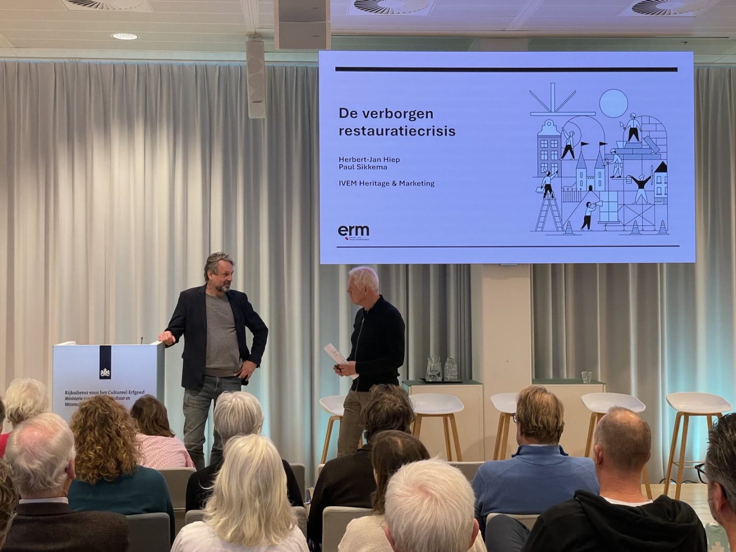 Wim van der Maas, voorzitter van het ERM-bestuur, reikte het eerste exemplaar van het rapport uit aan Arjan de Zeeuw, die de directie van de RCE vertegenwoordigde. Volgens Van der Maas kwam de arbeidsproblematiek telkens weer ter tafel bij de ERM, en vormde die urgentie de aanleiding tot het rapport. “Nu duidelijk is hoe we ervoor staan, spreek ik de hoop uit dat die urgentie ook doordringt bij zowel de O als de C van het Ministerie van OCW. We hebben elkaar nodig om dit probleem aan te pakken. En wellicht kan de RCE wel leidend zijn in die regierol, die nodig is om alle initiatieven die nu al bestaan in het land op het gebied van scholing, ook van elkaars bestaan weten en elkaar vinden.”